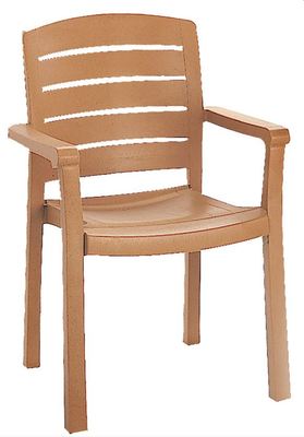 The sophisticated Acadia Classic Dining Armchair features a contoured ladder-back design and contoured seat for ergonomic comfort. Wood grained with a satin finish, the Acadia is made of 100% prime resin for long-lasting durability against the elements.