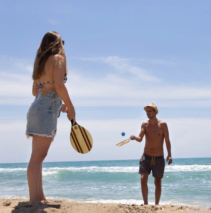 Bring the excitement of Frescobol to your next beach day with this beautifully crafted Frescobol Paddle Set! Known globally as Matkot, Racchettoni, or Paleta, this fast-paced paddle ball game is all about teamwork and endless fun. Made from nine bonded wood pieces with a stunning Beach Stripe design, each paddle is unique. The neoprene grip handles offer comfort for all-day play, and the water- and sand-resistant finish ensures durability. Includes two paddles, one ball, and a canvas storage bag—perfect for beach, park, or backyard fun!