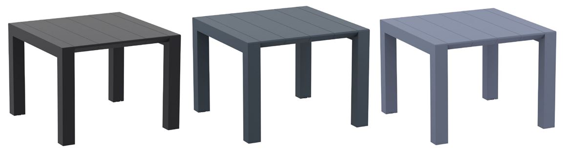 Vegas dining table is extendable in several sizes and colors. Resin top table is made for commercial durability. Practically extendable for accommodating more guests. UV treated. Hose down for cleaning. Withstands summer and winter outdoor temperatures. Made for outdoors.